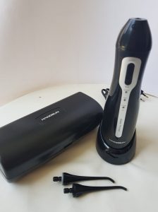 I had no idea what to expect. I was surprised at how stylish the product was, it came in a handy travel case with two different pressure applicators and a charger. I was equally surprised at how effective it was, so much quicker to use than dental floss (once you got the hang of it) less time-consuming. There are different water pressures to suit your taste – I chose the soft setting as I found this easier on my teeth.